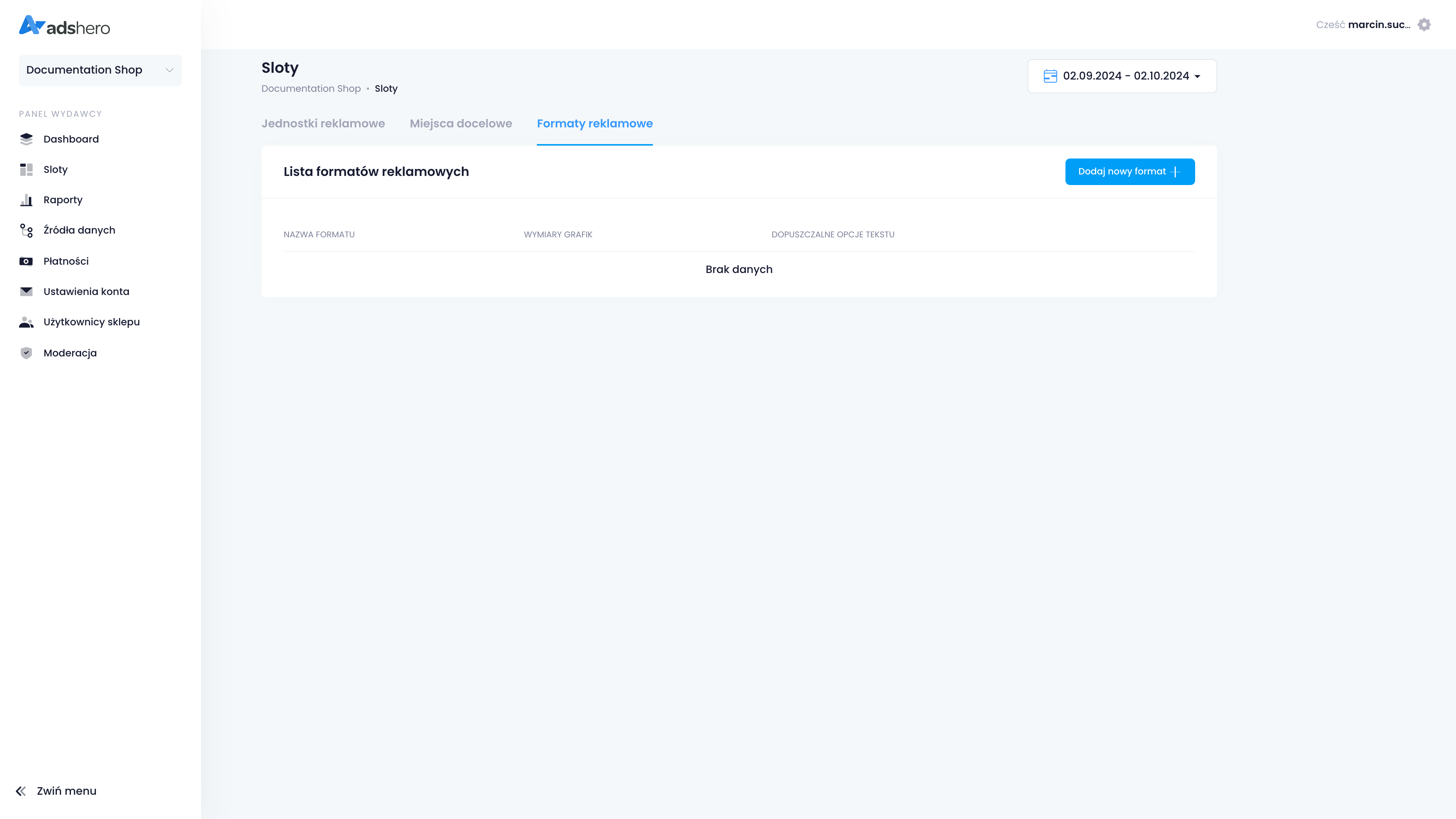 Aby utworzyć nowy format, przechodzimy do “Formaty reklamowe” w zakładce “Sloty”: