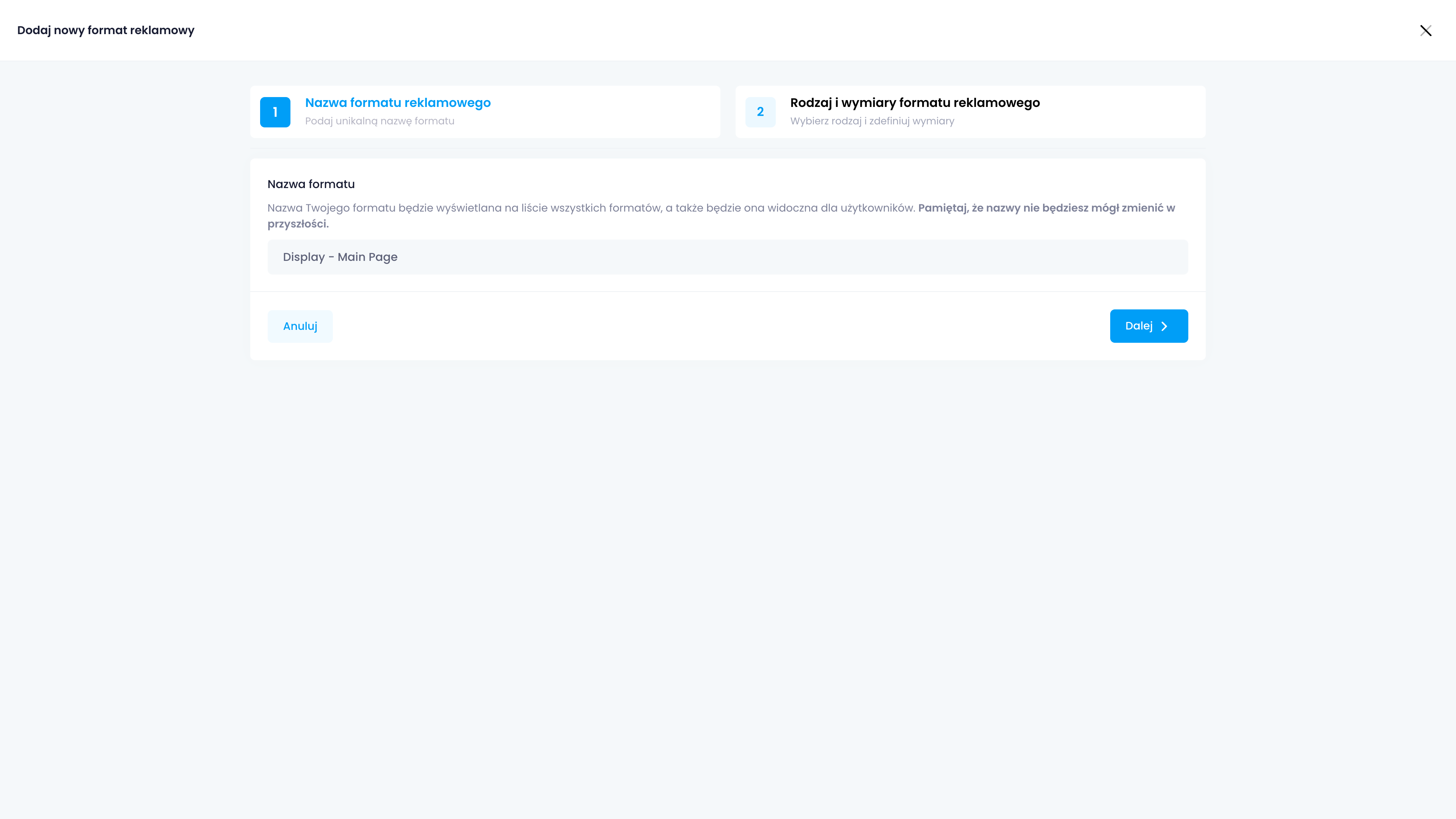 W pierwszym kroku podajemy nazwę formatu. Nazwy ani innych parametrów formatu nie można potem zmienić: konieczne jest wtedy przygotowanie nowego formatu.
