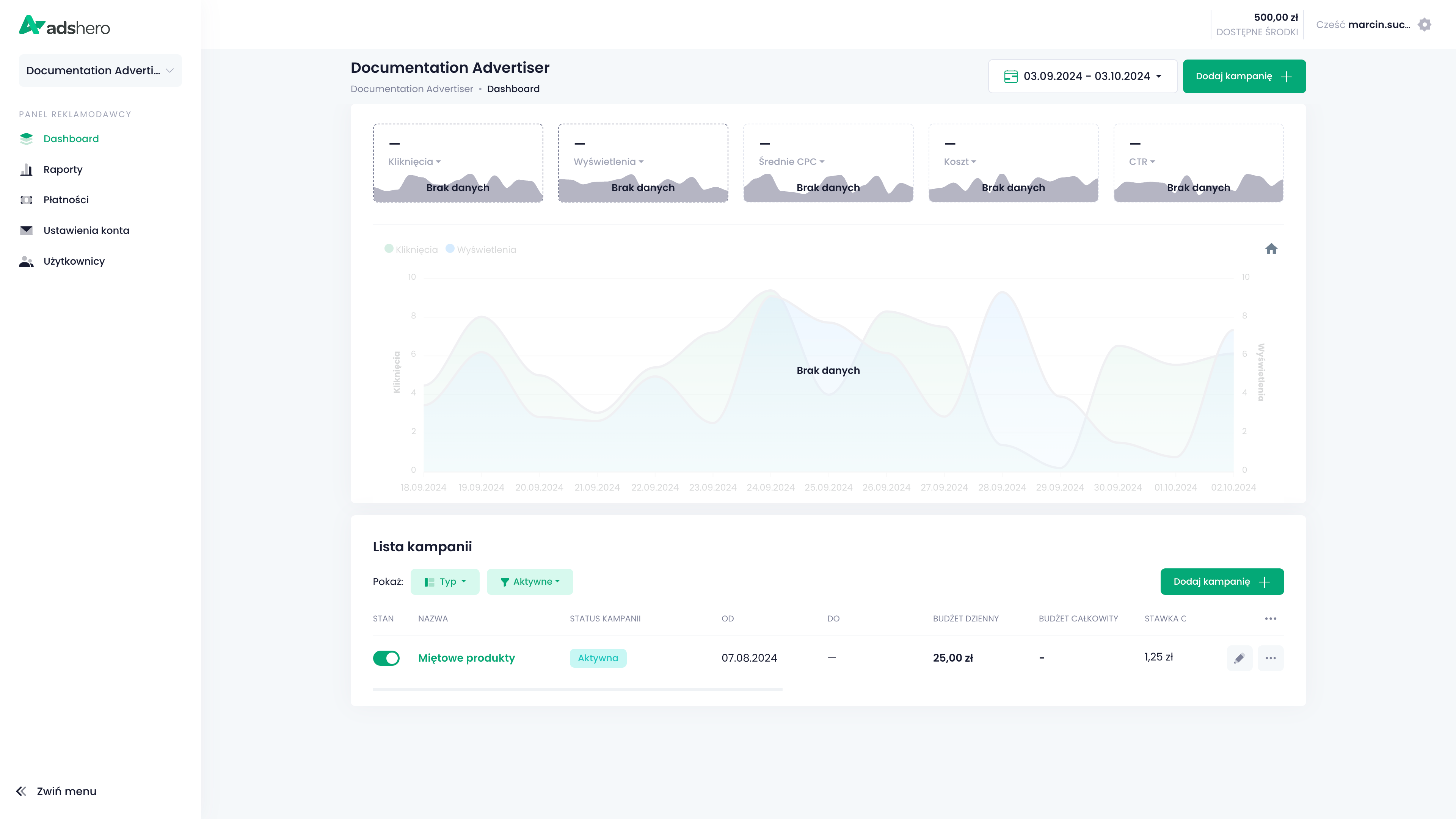 Na dashboardzie na liście kampanii klikamy “Dodaj kampanię”:
