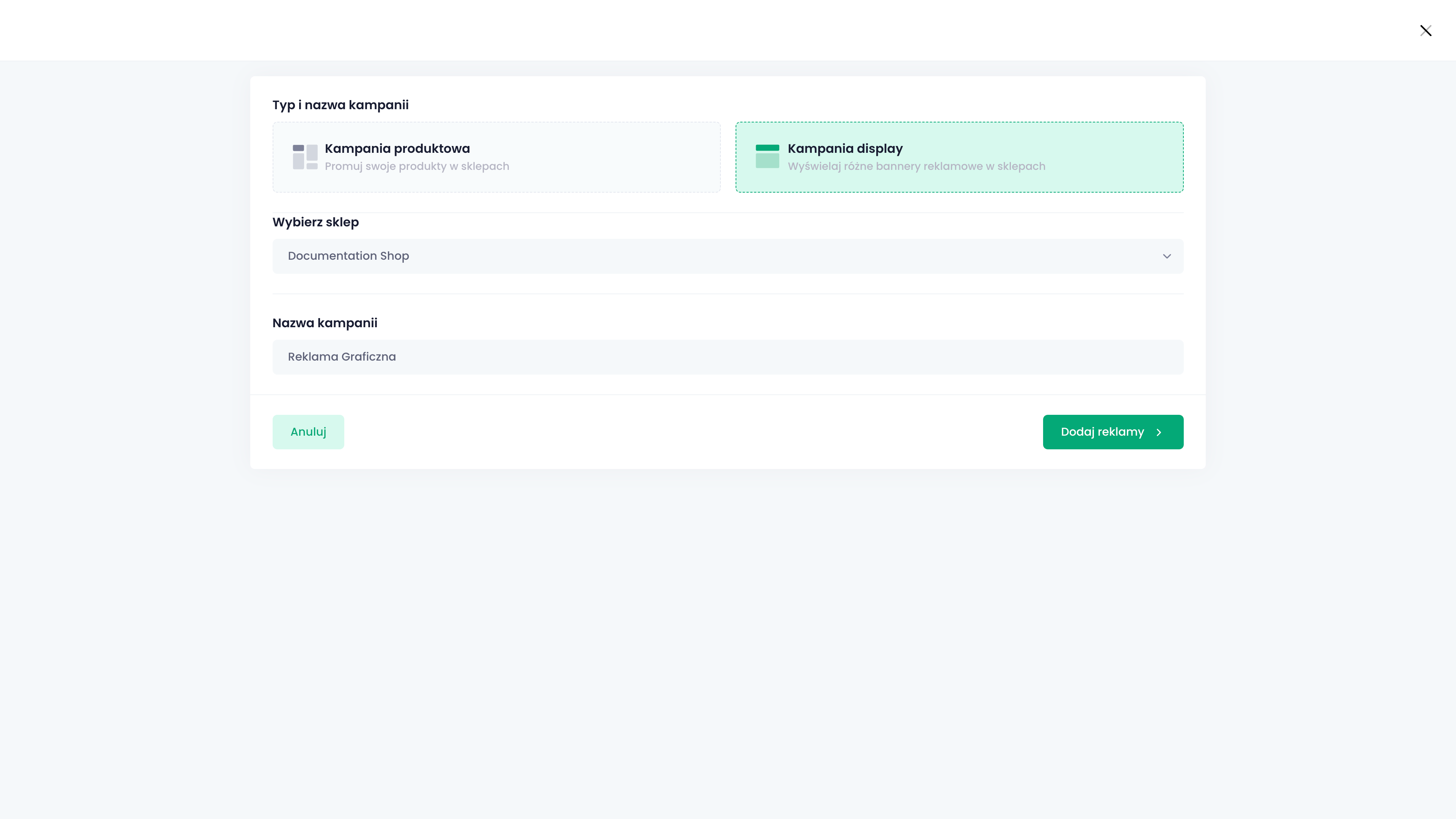 W pierwszym kroku wybieramy typ kampanii na “Display” (reklama graficzna) i wybieramy sklep, w którym ma być ona wyświetlana. Nie zacznie się ona wyświetlać od razu — ze względu na grafikę, nad której zawartością sklep nie ma kontroli, przechodzi ona moderację.