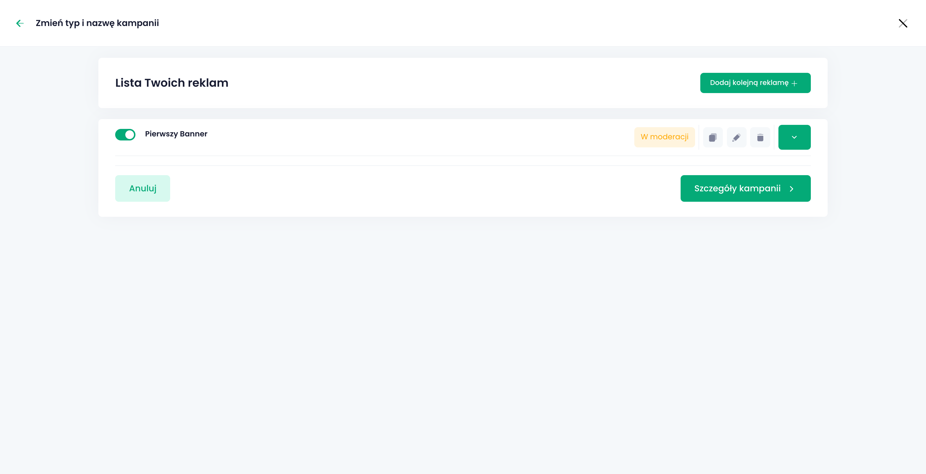 Nowa kampania jest widoczna na liście wszystkich kampanii i ma status “W trakcie moderacji”. Oznacza to, że wydawca (sklep) musi na początku zaakceptować reklamę, zanim zacznie się jej emisja.