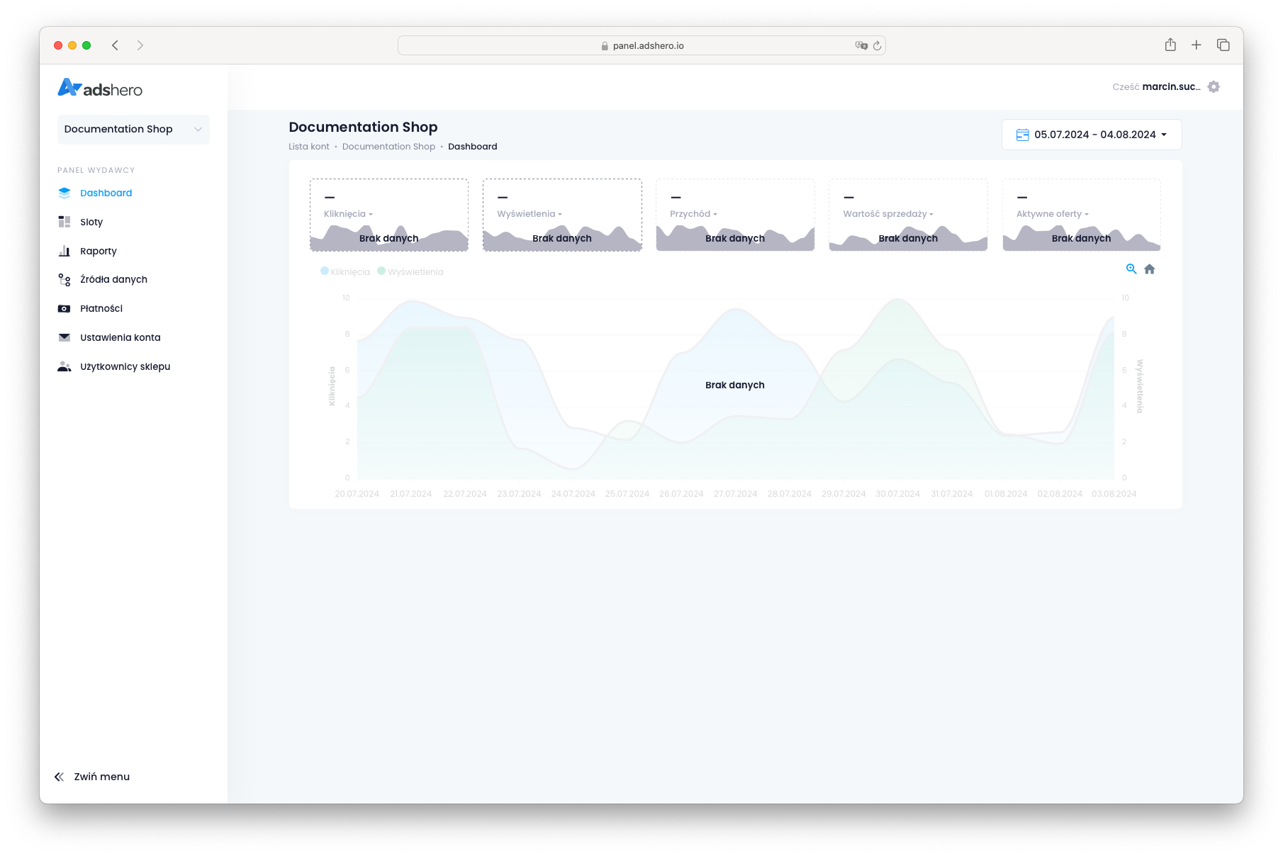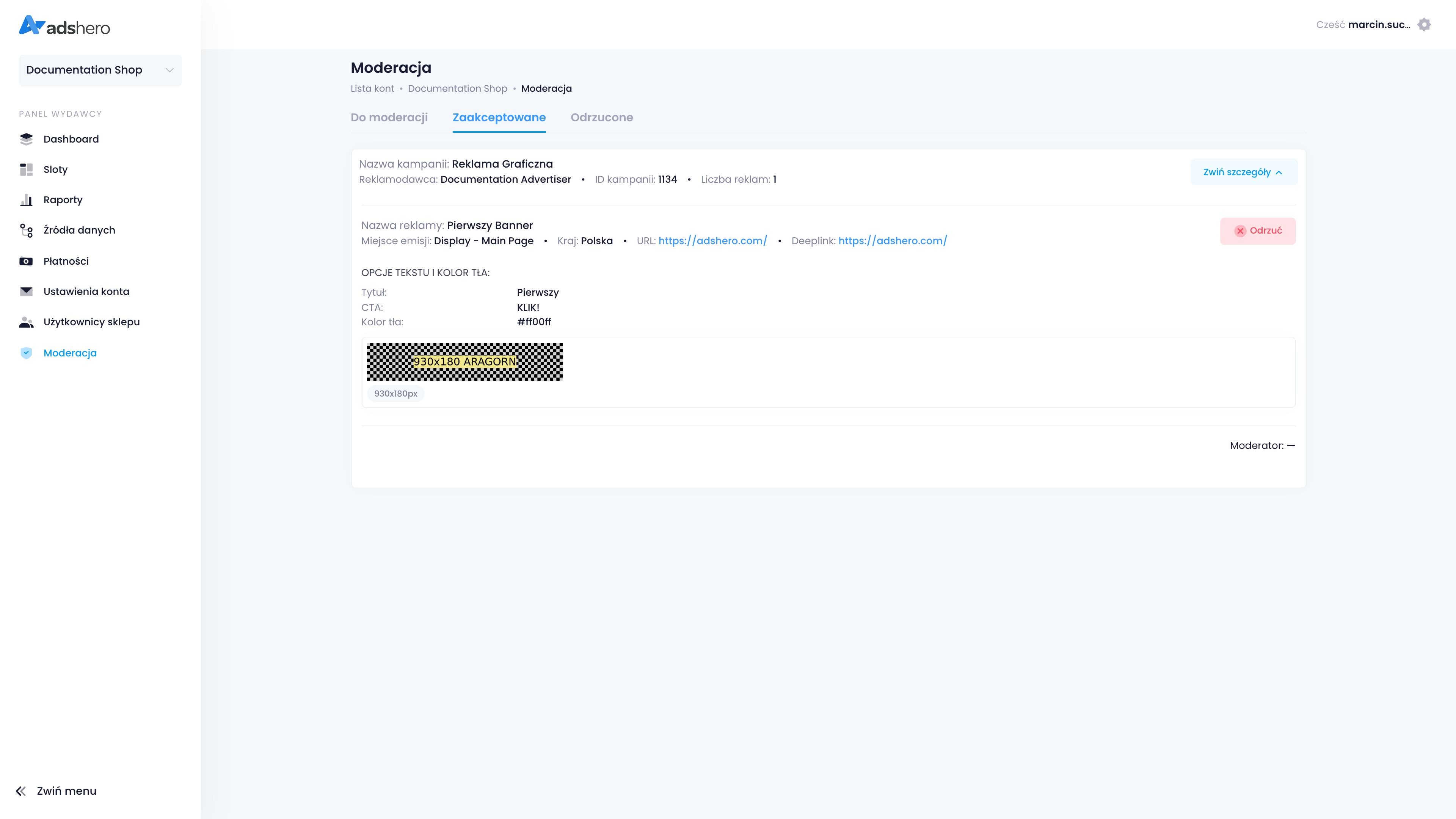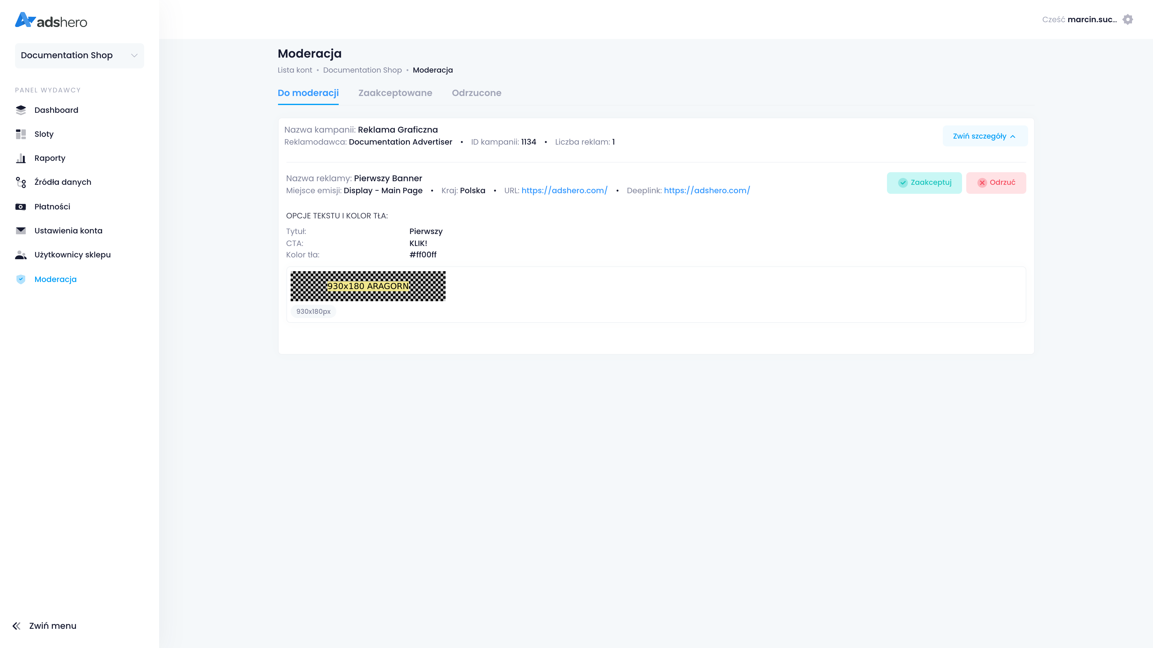 Przechodzimy do konta wydawcy (sklepu). Klikamy dropdown po lewej stronie i wybieramy “Konto sklepu”. Na liście znajdujemy nasz sklep i przechodzimy do zakładki “Moderacja” w panelu po lewej. Reklama z utworzonej kampanii oczekuje na moderację — po rozwinięciu jej klikamy “Zaakceptuj” (w rzwczywistości należy sprawdzić, czy reklama spełnia standardy sklepu!):