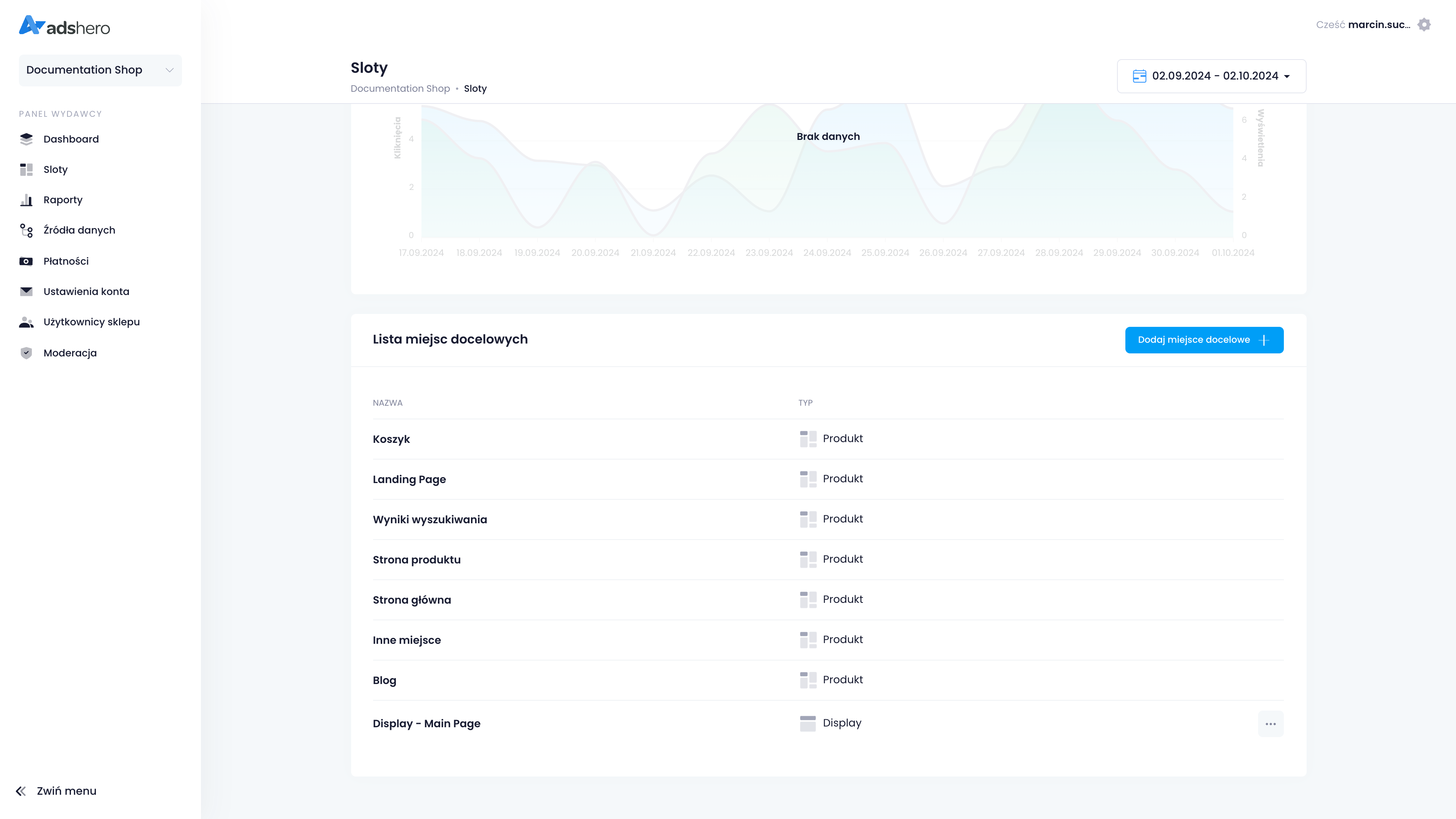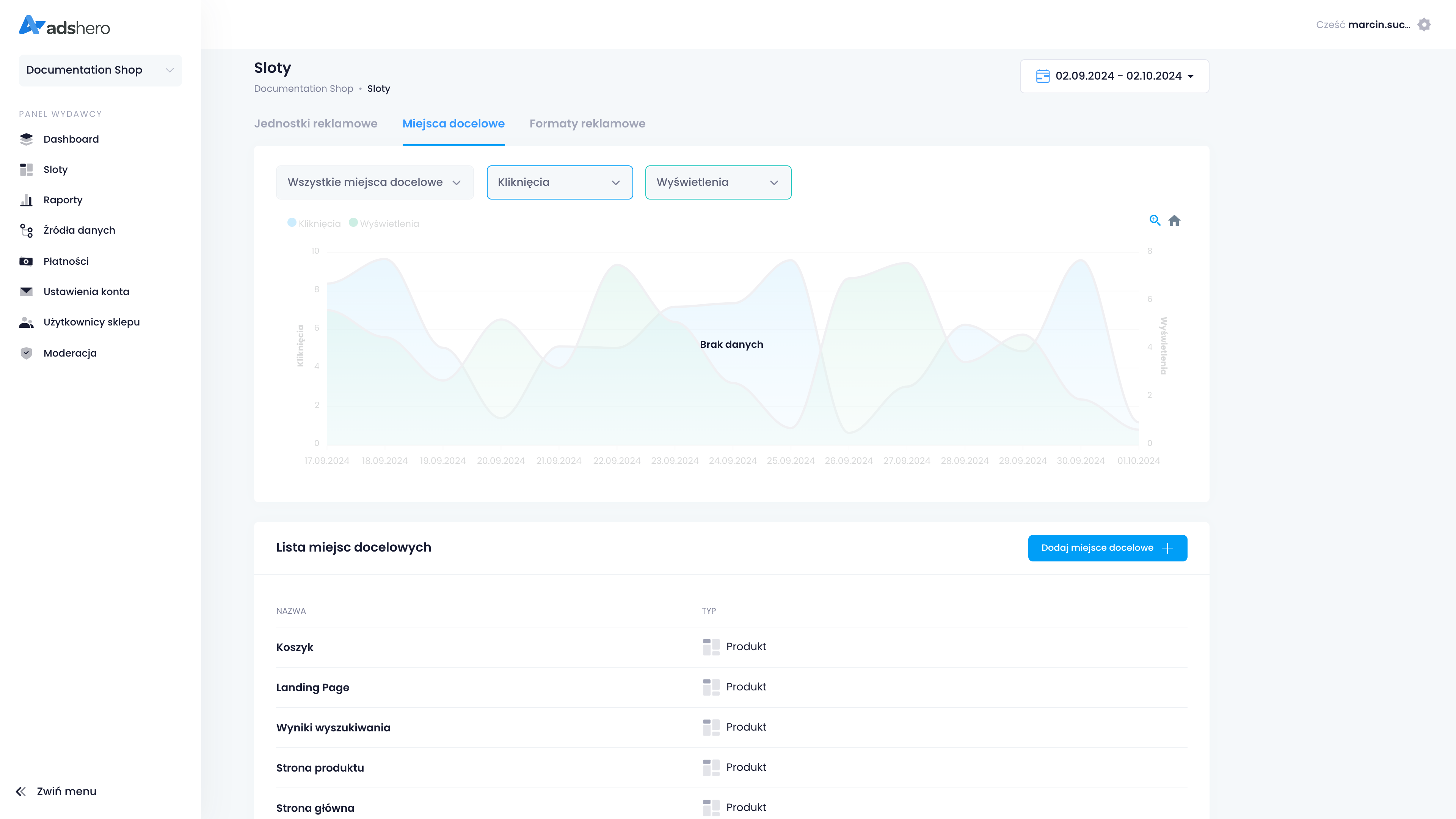 Aby utworzyć nowe miejsce docelowe, wchodzimy w zakładkę “Sloty” po lewej stronie, a następnie “Miejsca docelowe”: