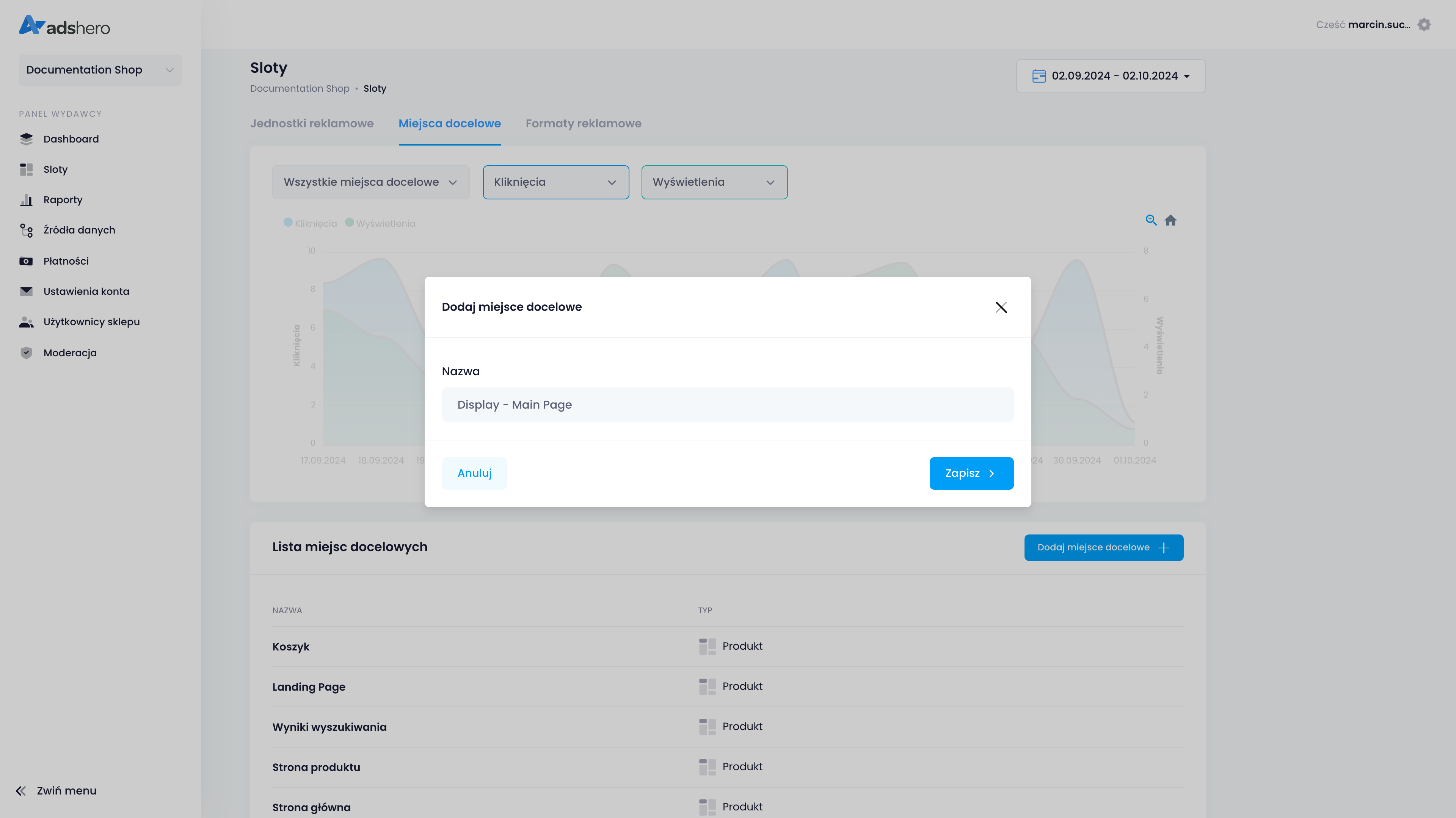 Na początku tworzymy nowe miejsce docelowe dla reklamy graficznej. Miejsca docelowe (zbiory jednostek reklamowych) mają określony typ: produktowe miejsca docelowe mogą zawierać w sobie tylko produktowe jednostki reklamowe i emitować oferty sponsorowane. W przypadku typu display pozwalamy na powiązanie z nimi tylko jednostek reklamowych, które także mają typ display i emitują reklamy graficzne.