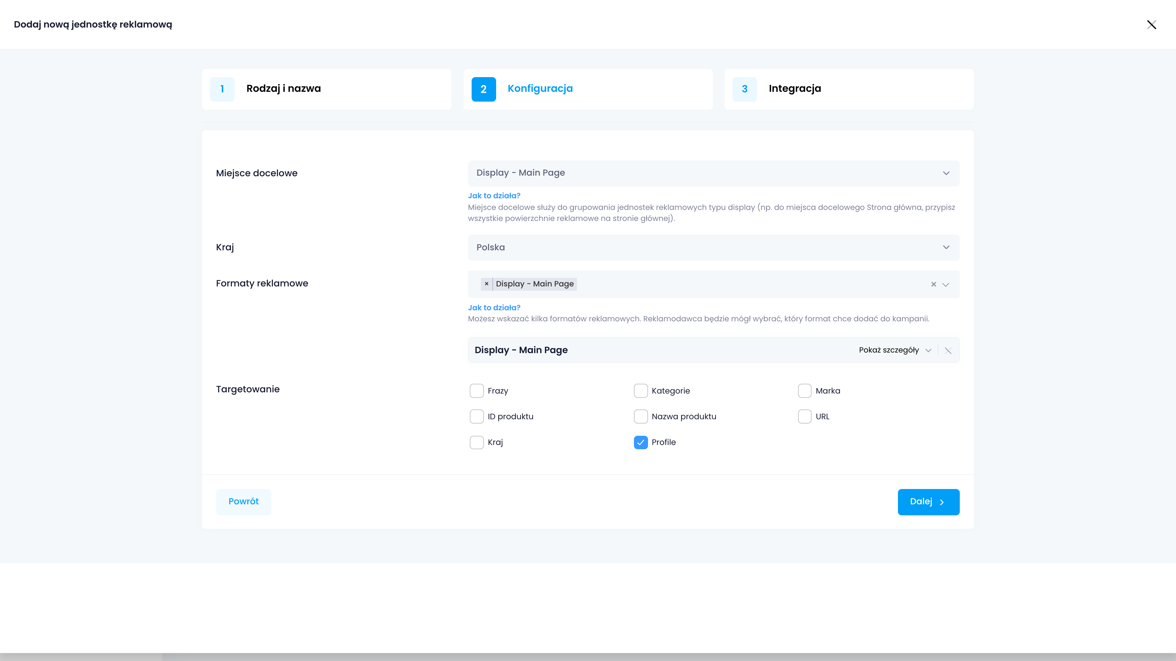 W drugim kroku wybieramy miejsce docelowe — w tym wypadku wybieramy to nowo utworzone. Oprócz tego konieczny jest wybór formatów grafiki, które mogą być wyświetlane w danym miejscu — formaty reklamowe. W przykładzie wybieramy ten, który utworzyliśmy w poprzednim kroku.