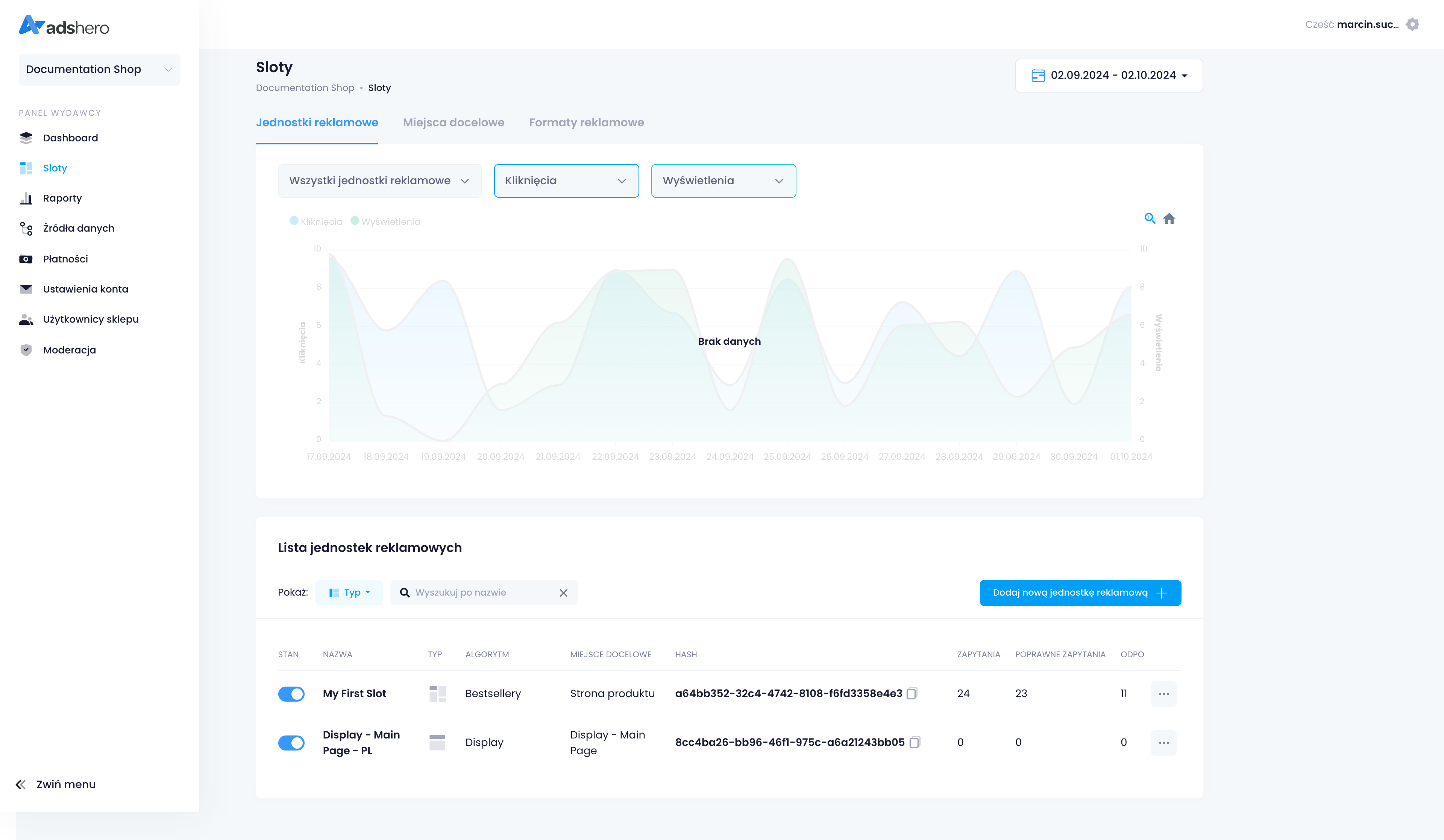 }slotHashto identyfikator jednostki reklamowej dostępny w panelu wydawcy (sklepu) na liście jednostek reklamowych (menu “Sloty”).adCount(w przykładzie wartość1) to maksymalna liczba reklam, które mają być zwrócone.