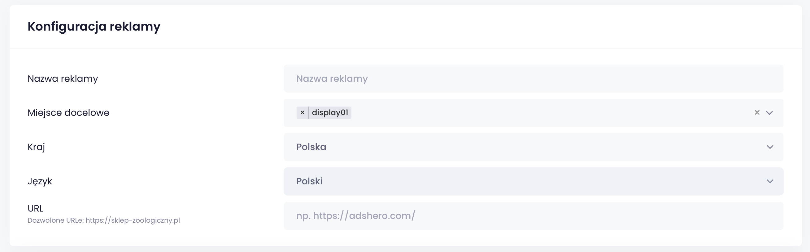 W panelu Adshero konfiguracja targetingu reklamy display zaczyna się od wyboru miejsca docelowego, jezyka oraz kraju dla którego chcemy wyświetlić reklamę: