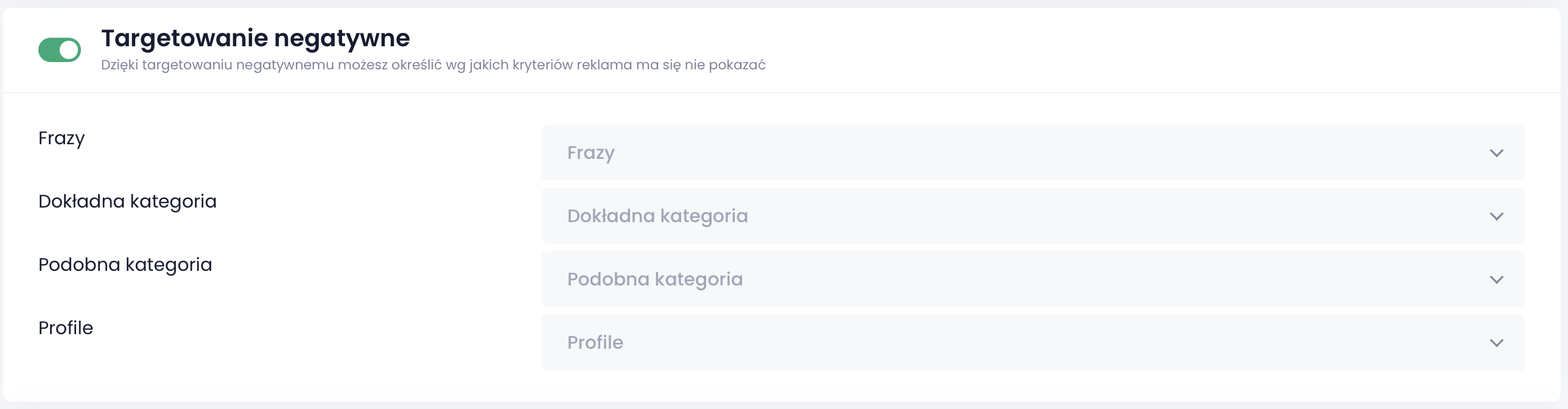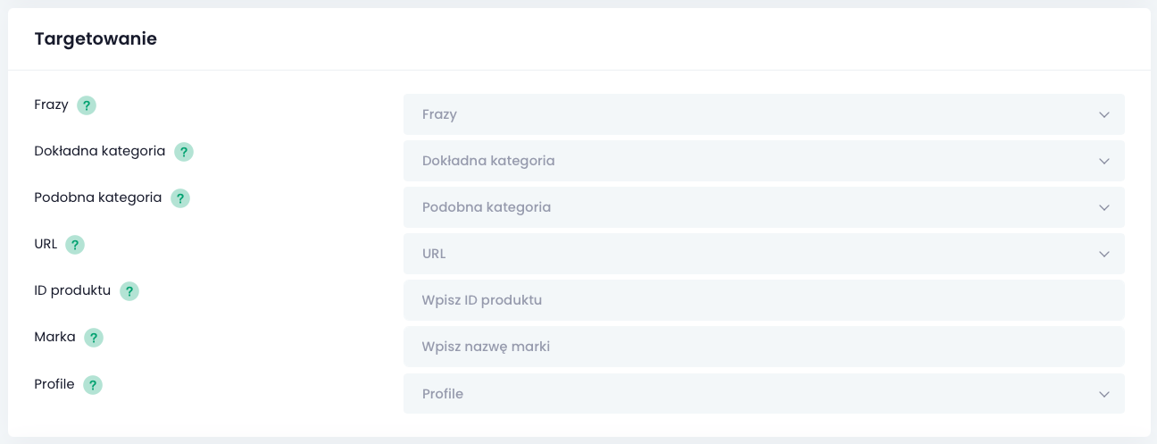 Po wyborze odpowiedniego miejsca docelowego, pojawi się możliwość ustawienia dodatkowych parameterów. Targetować można po frazie, kategorii (dokładnej lub podobnej), marce oraz profilach. Parametry targetowania zostały opisane poniżej.