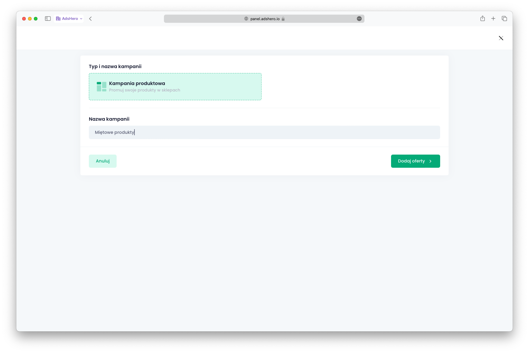 Aby reklamy wyświetlały się na jednostce reklamowej, musi istnieć kampania z produktami do reklamowania. Przechodząc na konto reklamodawcy, należy kliknąć “Dodaj kampanię” i podać nazwę kampanii: