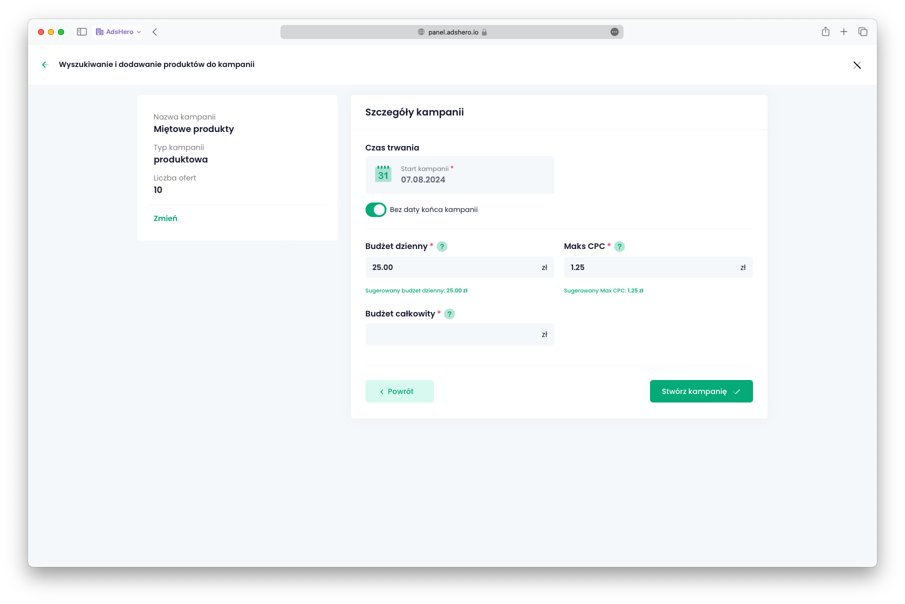 W ostatnim kroku wybieramy czas trwania kampanii oraz budżet: