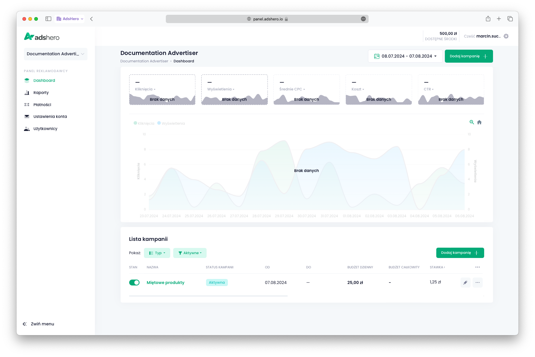 Po kliknięciu “Stwórz kampanię” jesteśmy przekierowani na dashboard z listą kampanii. Nowo utworzona kampania jest widoczna: