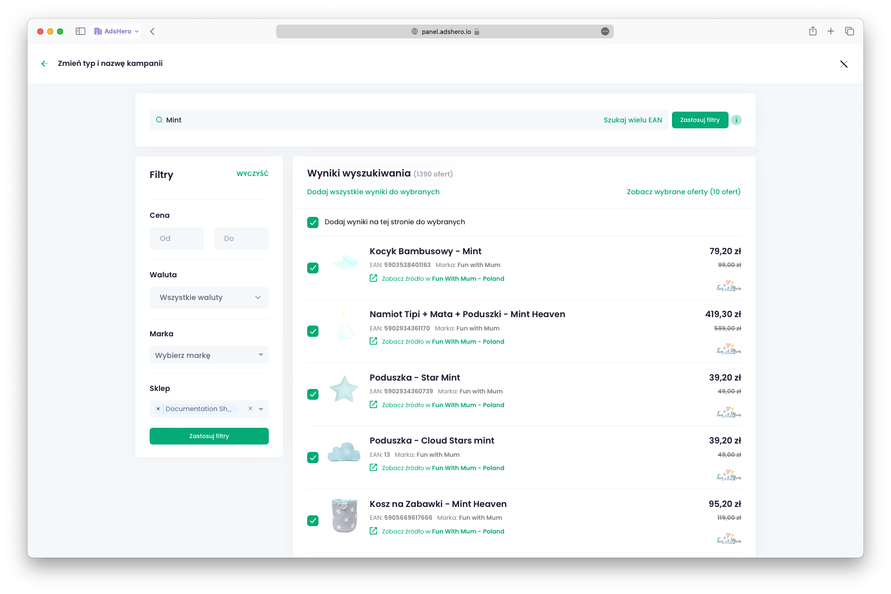 W drugim kroku wybieramy produkty do reklamowania. Jeśli chcemy ograniczyć je do jednego sklepu, to po lewej stronie możemy wybrać sklep, z którego produkty będą dostępne do wyboru. W przypadku whitelabel reklamodawcy mają dostęp do tylko jednego sklepu.