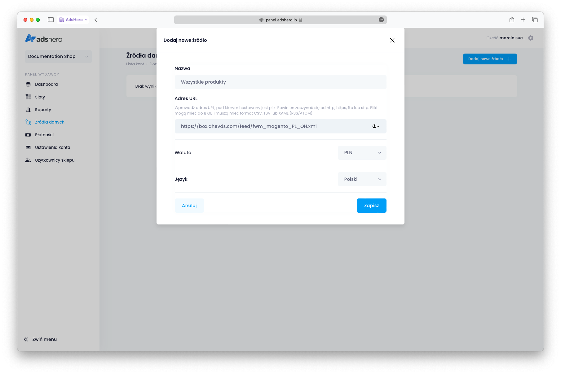 Aby wgrać feed, należy na koncie sklepu (wydawcy) wejść w “Źródła danych” i następnie kliknąć przycisk “Dodaj nowe źródło”.