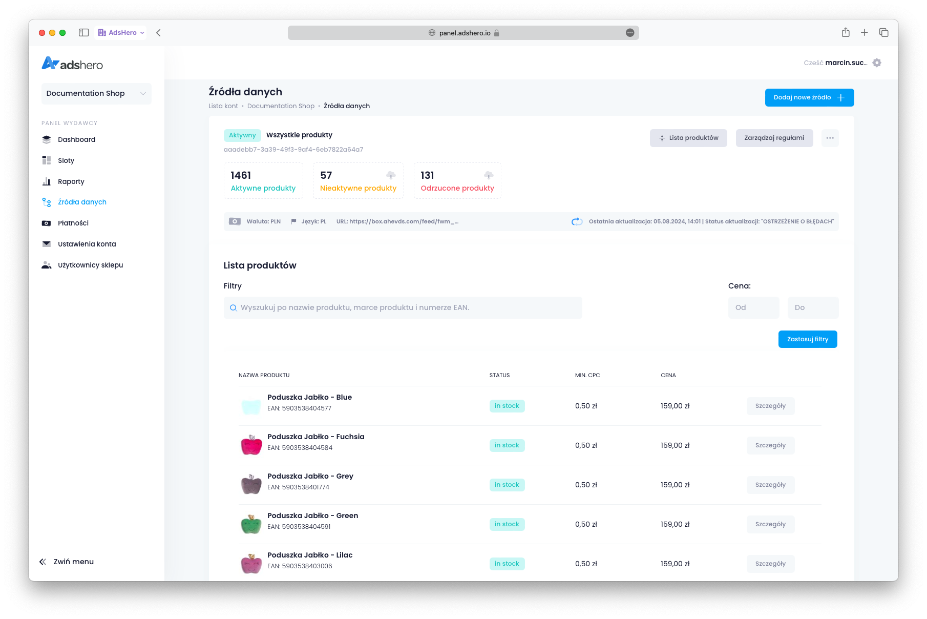Feed produktowy to plik z listą produktów dostępnych w sklepie. Jeśli posiadasz już feed produktowy w formacie XML dla Google Merchant Center, to możesz go wykorzystać w AdsHero. W przeciwnym wypadku przygotuj feed produktowy według specyfikacji.
