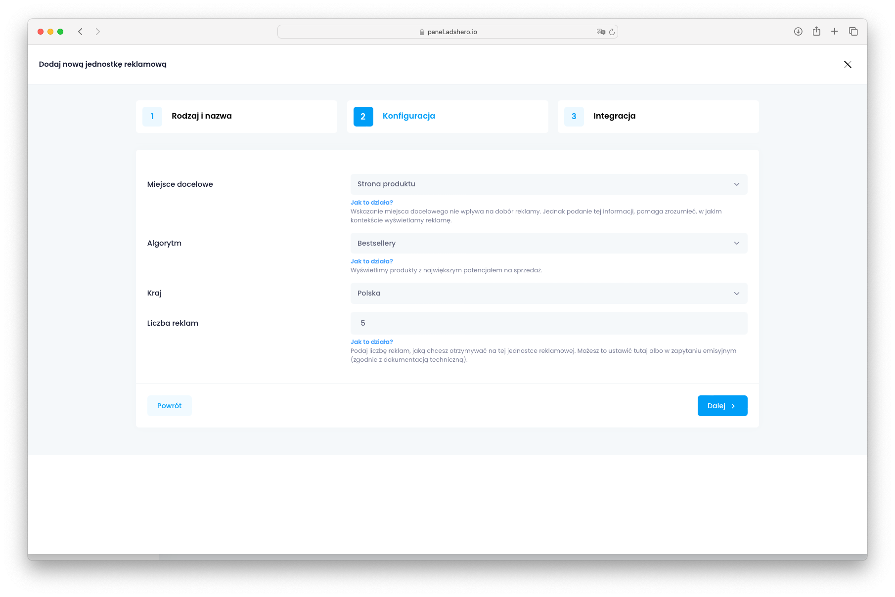 W drugim kroku wybieramy miejsce docelowe oraz algorytm. W przypadku “Strony produktu” podobne produkty i bestsellery są dobrym wyborem. Natomiast dla wyników wyszukiwania (listing) preferowanym algorytmem jest dopasowanie do kontekstu.