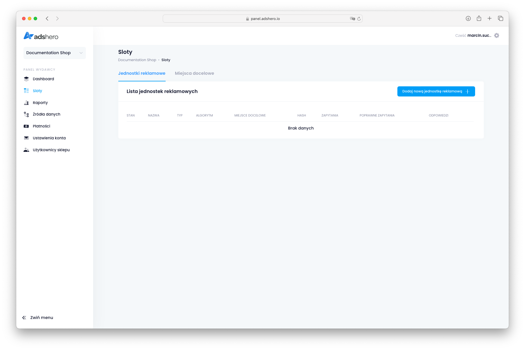 W celu wyświetlenia produktów na stronie należy przygotować jednostkę reklamową. Jednostka reklamowa to miejsce na stronie, gdzie wyświetlane są reklamy. Jednostki docelowe grupuje się w “miejsca docelowe” — np. na stronie produktu możemy chcieć umieścić reklamy w dwóch miejscach i wtedy tworzymy dwie jednostki reklamowe powiązane z miejscem docelowym “Strona Produktu”.