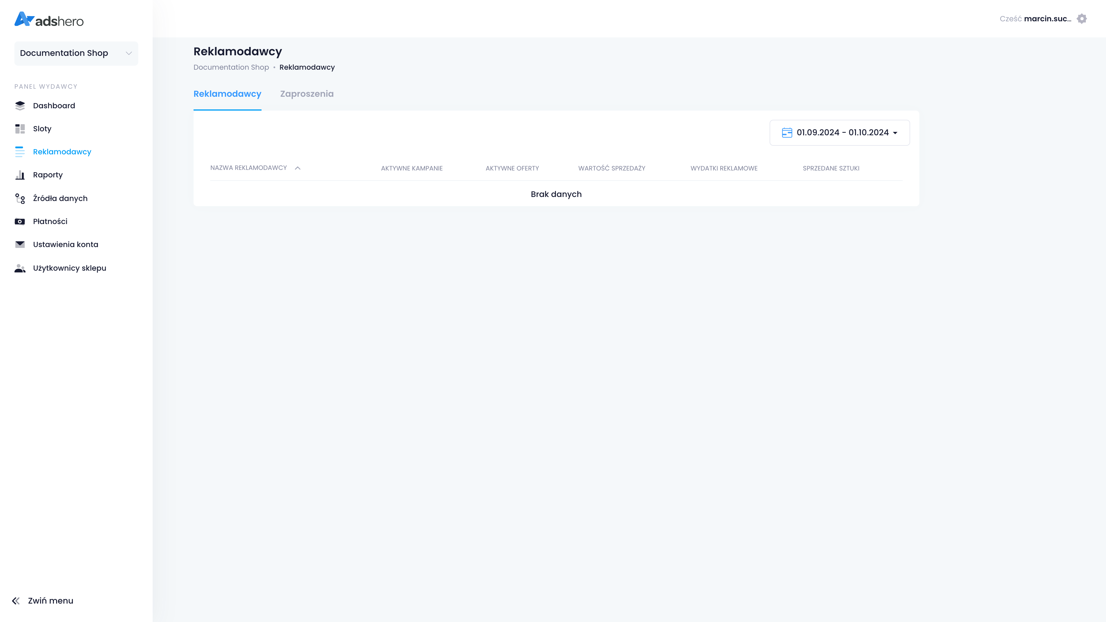 Po zalogowaniu do panelu i wejściu na konto sklepu należy przejść do zakładki “Reklamodawcy” (jest ona widoczna dopiero po skonfigurowaniu whitelabel):